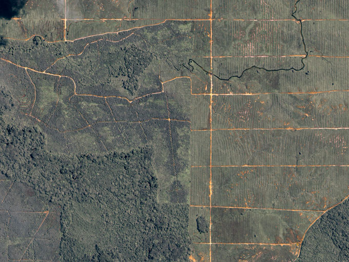This satellite photo shows intact forest, cleared land, and an oil palm plantation in Malaysian Borneo.
