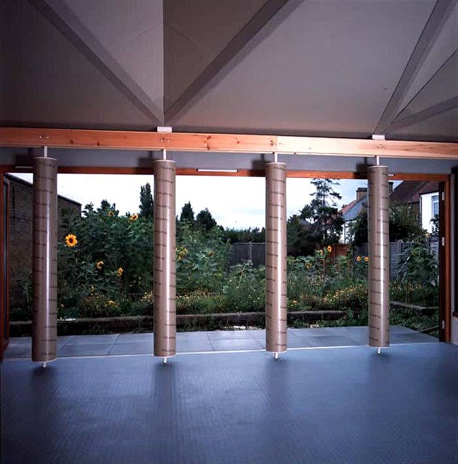 Cardboard tubes provide the structural support columns in this innovative, 90% recyclable cardboard building.