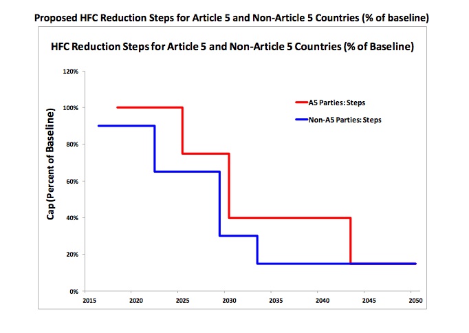 With China’s backing, the U.S. will propose an amendment to the Montreal Protocol that calls for a phased reduction of HFCs. Developing countries (depicted by the red A5 line) would be responsible for less immediate reductions, but by 2043 all signatories would be required to cut HFC emissions by 85% from a baseline measured in 2010. Requirements for reporting are included in the Amendment.