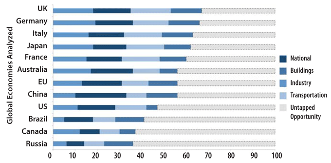 The ACEEE “International Energy Efficiency Scorecard” ranks 12 of the world’s largest economies based on 27 energy-efficiency metrics regarding buildings, industry, transportation, and efforts at the national level. Top scorers were the U.K., Germany, Italy, and Japan; the U.S. ranked ninth.International Energy Efficiency Score Comparison