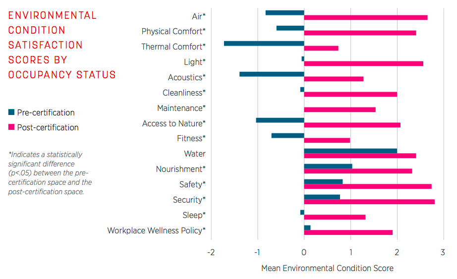The research tested “workspace extremes” intentionally, the study says, to create a clear contrast between top-notch design and relatively poor conditions. As hoped, the difference in indoor environmental quality between the old space and the new—which achieved Platinum ratings under both LEED for Commerical Interiors and the WELL Building Standard—was significant. Acoustics improved by 50%, lighting by 63%, and ventilation by 158%.