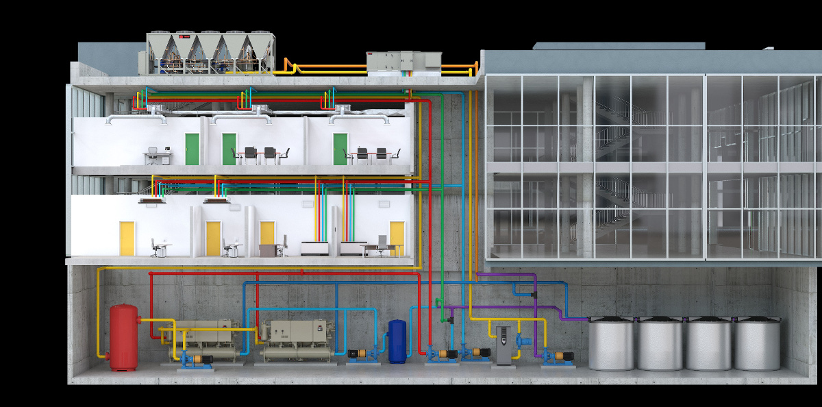 This rendering shows a possible installation of Trane’S SSHP system, where the system’s use of thermal energy storage tanks increases the usefulness of TES as well as the air-to-water heat pumps.