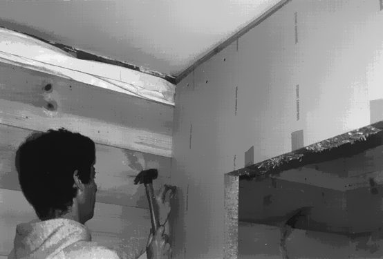 Nadav toe-nailing Stramit panels into an adjacent wall