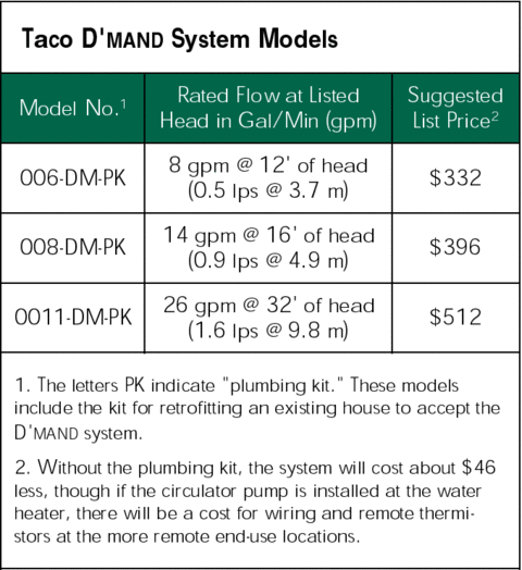 In a brochure about the D’mand system, Taco shows that if water consumption is reduced by 40 gallons (150 l) per day and the water heater setting is lowered, annual dollar savings (water, sewage, and energy) could total up to $180 with gas water heating and $500 with electric water heating. While these values may be exaggerated, the savings are clearly great enough to justify this system from a life-cycle costing standpoint—let alone the environmental benefits of resource savings.
